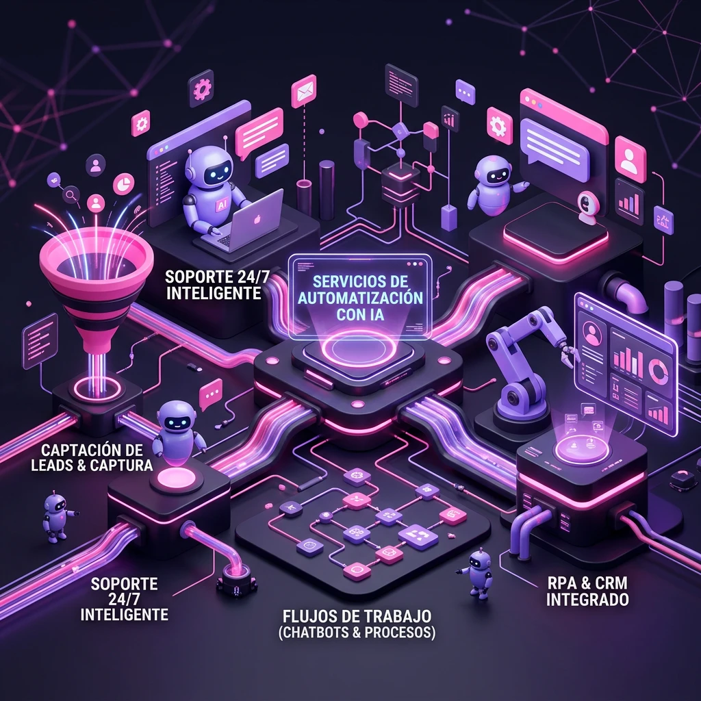 Ahorra cientos de horas al mes. Implementamos chatbots 24/7 y automatizamos tu CRM para captar leads, calificar prospectos y dar soporte en piloto automático.